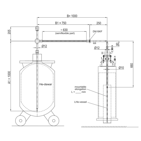 主要用來從大型液氦杜瓦瓶傳輸液氦至小型液氦杜瓦瓶,或者從用液氦杜瓦瓶為核磁做補液使用。根據客戶具體用途定制柔性管路和硬管具體長度。